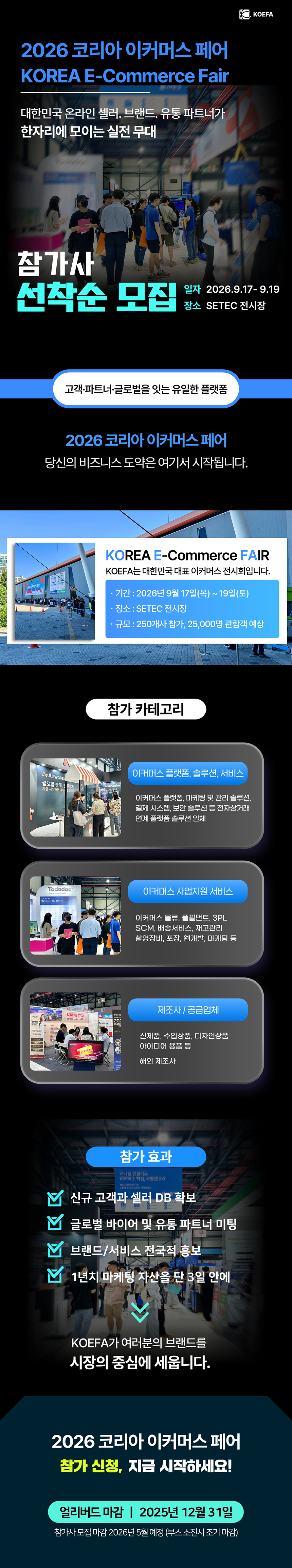 * 구체적인 모집 카테고리  1. 이커머스 플랫폼 제공 기업 - 이커머스 플랫폼 및 해외 진출 지원 플랫폼 2. 이커머스 솔루션 제공 기업 - 결제 솔루션: PG사, 결제 게이트웨이 제공 업체  - 물류 및 배송 솔루션: 로봇 배송, 스마트 물류 서비스 등과 같은 최신 물류 솔루션 등 3. 마케팅 및 광고 관련 기업 - 디지털 마케팅 솔루션: 이커머스 사업자들이 효과적으로 온라인 광고를 운영하는 데 도움을 주는 솔루션 - 인플루언서 마케팅 플랫폼: 인플루언서와 브랜드를 연결하는 플랫폼 등 4. IT 및 AI 솔루션 기업 - AI 기반 데이터 분석: 고객 행동 분석, AI 기반 맞춤형 추천 시스템 등  - 클라우드 및 서버 솔루션: 이커머스 웹사이트의 안정성을 유지하는 데 중요한 클라우드 서비스 제공 기업 등 5. 혁신 기업 - 신흥 배송 기술, AI 마케팅, VR 쇼핑 등 혁신적 아이디어를 가진 신규 솔루션 6. 친환경 및 지속가능성 관련 기업 - 지속 가능한 이커머스: 친환경 포장재 제공업체, 지속 가능한 운영 방식을 지원하는 이커머스 기업 등 7. 해외 및 크로스보더 이커머스 기업 해외 물류 및 글로벌 확장 지원 기업: 글로벌 물류, 국제 배송, 해외 결제 솔루션 등 8. 상품 제조사/공급사 : 수입상품, 생활소비재, 가공식품 등 * 참가 목적에 따른 '코이페' 활용 포인트   1. 목표 고객과의 직접적인 만남 : 이커머스 기반 사업자&셀러 2만 명 이상 방문 : 잠재 고객과 직접 대면할 수 있는 중요한 기회 제공 : 제품과 서비스를 체험하게 하면서 즉각적인 피드백을 얻고, 신뢰를 구축할 수 있습니다.(신제품 테스트) : 입점 기업 유치 및 사업자 대상 회원가입 유도 가능 : 실제 셀러 대상 데모 체험 / 계약 유도 가능 : 공동 프로모션 또는 세일즈 파트너 모집 가능  2. 비즈니스 네트워킹 : 서비스 홍보, 회원 모집 최적의 장! : 업계의 주요 관계자들과의 네트워크를 형성할 수 있는 최적의 장소 : 바이어, 유통업체, 투자자들과의 직접적인 만남을 통해 새로운 비즈니스 기회 창출  3. 브랜드 인지도 향상 : 유망 고객과 지속적인 비즈니스 매칭, 네트워킹, 제휴 기회 : 짧은 시간 안에 많은 고객들에게 브랜드를 알릴 수 있는 기회 : 온라인 마케팅만으로는 얻기 힘든, 실질적인 브랜드 인지도를 높이는 데 효과적(브랜드 포지셔닝) : 데모체험 및 샘플 테스트를 통한 수요 확인 : 신제품 및 신규 서비스 초기회원 확보 4. 경쟁사 분석 : 한 공간에서 경쟁사들을 관찰하고, 그들의 마케팅 전략, 제품, 서비스 등을 분석 가능 : 자사만의 차별화된 전략을 수립하는 데 도움이 됩니다. 5. 매출 증대 : 단순히 브랜드를 알리는 것에 그치지 않고, 즉각적인 매출 증대로 이어질 수 있는 기회   : 현장에서 이루어지는 거래와 이후의 후속 조치가 매출 성장을 촉진   : 실제 사업자 대상 소싱제안 및 공급 제휴 가능   : 유통채널 다각화 가능 / 파트너 발굴 기회   : OEM/OEM 매칭 및 리드 확보, 계약 유치   ※ 부스참가 신청 관련 안내사항  · 부스 신청 : 선착순 신청 / 부스 소진 시 조기 마감 가능 · 부스 배치 : 참가신청 및 계약금 납입순서, 참가규모와 형태(독립,기본,목공)를 기준으로 전시 효율성을 최대로 고려하여 주최자가 배정 · 1개 기업 신청 가능 부스 수 제한 없음 / 독립부스는 2부스 이상 신청 가능 · 참가 신청 순 부스 위치 우선 협상  · 서비스 발표 기회 제공 (무료) · 부스 신청&서비스 발표 선착순 마감 · 전시 부스 참가 외 스폰서십 참가 접수 동시 진행     ■ 이커머스 사업자와의 직접적인 대면 기회를 제공하는 행사는 국내에서 <코리아 이커머스 페어>가 유일하며 전시부스 참여 기업은 다음과 같은 마케팅과 세일즈 활동이 가능합니다.   1) 사업 설명회 세션 참여, 즉시 상담 유도로 세일즈 리드 DB확보  2) 서비스 브랜딩, 사업 설명회 세션 운영, 신규 서비스 홍보  3) 잠재적 고객 및 신규 파트너 유치, 동종업계 네트워크 구축  4) 판매촉진 프로모션, 쿠폰 배포 이벤트 개최  5) 고급 정보 수집 : 시장 및 경쟁사 조사, 고객 동향 파악, 피드백 수렴  6) 언론 홍보 및 바이럴 마케팅 기회 확보 ※ 본 행는 세미나, 컨퍼런스, 전시회가 결합된 콘펙스(Confex) 형태로 진행됩니다.  콘펙스(Confex)란, Conference + Exhibition 의 합성어로 컨퍼런스와 연계해  전시회와 컨벤션 관련 프로그램을 동시에 여는 행사를 의미합니다.