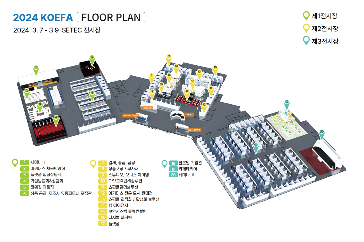 <2024 코리아 이커머스 페어> 부스 참가기업 모집공고 (카테고리별 선착순) 부스 소진 시 조기 마감 온라인 사업자 중심 비즈니스 이벤트 <코리아 이커머스 페어>에서 다양한 사업자를 직접 만나 마케팅과 세일즈 성과를 동시에 거두고자 하는 전시 파트 부스 참가기업을 모집중에 있습니다. 귀사의 상품 또는 서비스의 대상고객이 통신판매사업자라면, 새로운 유통 파트너, 또 다른 기회를 만들고자 하는 제조사&공급사라면, 경영전략 차원에서 <코리아 이커머스 페어>를 검토해보시기 바랍니다! About <2024 코리아 이커머스 페어> 본 행사는 온라인 유통사업자뿐만 아니라 제조사, 소상공인, 상품기획자, 온라인 전문셀러, 예비창업자, 스타트업에 이르기까지 폭넓은 사업자를 대상으로 대한민국 이커머스의 기술과 트렌드, 통찰력과 비전을 제시할 목적으로 기획된 비즈니스 이벤트입니다. 이커머스와 관련된 기업과 정보를 한곳에 모아 안내하고, 실효성 있는 프로그램을 제공하여 대한민국 이커머스 분야의 내비게이션 역할을 하고자 합니다. 전시회 부스 참가 효과는 코리아 이커머스 페어는 세미나, 이벤트, 전시회가 결합된 콘펙스(Confex) 형태로 진행됩니다. 콘펙스(Confex)란, Conference + Exhibition 의 합성어로 전시회와 연계해 컨퍼런스, 포럼 등 컨벤션 관련 프로그램을 동시에 여는 행사를 의미합니다. 보통 전시회는 행사의 명칭과 카테고리, 프로그램 통해 어떤 분야를 주제로 하는지 파악할 수 있는데, 바로 이 점이 불특정 다수가 아닌 목적이 뚜렷한 사람들만 모일 수 있게 하는 필터 역할을 합니다. 코리아 이커머스 페어에는 당연히 전자상거래나 상품소싱, 솔루션, 물류, 플랫폼 등에 관심있는 사람들만 모이게 되겠죠. 이러한 사람들이 주요 고객이라면, 우리회사의 가치와 차별성을 인식시키는데 너무나도 쉽고, 효과 좋은 마케팅 기회가 될 수 있습니다. (※ 참고 : 아래 '코리아 이커머스페어' 구성계획은 참가기업의 접수 상황에 따라 조정될 수 있습니다) ![]() <2024 코리아 이커머스 페어> 행사장 구성 계획 2024년부터 개최되는 '코리아 이커머스 페어'는 새로운 공간구성 계획과 다양한 부대행사가 더해져 더욱 흥미롭게 진행될 예정입니다. 구체적인 설명 시작해 볼게요! ↑상단 이미지의 번호에 맞춰 작성한 설명이오니 참고하여 주시기 바랍니다 [1번 세미나장] '코이페(코리아이커머스페어)'의 메인 프로그램! 비즈니스 스킬업 세미나는 1전시실과 3전시실 두 곳에서 진행됩니다. 이번 회차 무대에 서는 전문가는 누구일까요? 기대해주세요! [2번 이커머스 채용 박람회] 일자리 창출은 본 행사 주최를 맡은 (사)서울온라인비즈니스협회의 또 하나의 미션이자 비젼입니다. 다른 무엇보다 신중해야 하는 인재 채용! 이커머스 관련 직종의 직원채용을 앞두고 계신다면, 저희에게 말씀해주세요! 저희가 널리널리 알려볼게요! [3번 플랫폼 입점상담회] 입점 기업(셀러) 모집이 필요한 커머스 플랫폼이라면 [플랫폼 입점상담회]에 참가해보세요! 정확히 필터링 된 온라인 셀러를 직접 만나 정교한 판촉 프로모션이 가능한 기회가 될거에요! ![]() [4번 기업발표회&상담회] 신규 서비스 또는 신제품 출시 기업이라면! 론칭쇼로 [기업발표회&설명회]를 활용해보세요! 이커머스 사업을 돕는 혁신적인 솔루션, 새로운 서비스, 신제품 출시를 앞둔 기업과 그것을 알고자 하는 사업자들의 자연스러운 만남! 2024년 상반기부터는 조금 더 견고하게 구성해볼 계획입니다! 발표하고 상담까지 원스톱으로!! [5번 코워킹라운지] 언제나 바쁜 온라인 셀러분들, 그리고 참가기업의 틈새업무를 위한 [코워킹라운지]가 필요하겠죠! 저희 행사장 한켠을 코워킹 라운지로 꾸며주면서 자연스럽게 브랜드 홍보->입주 및 대리점 상담까지 공유오피스 사업자분들! 환영합니다! 협업 문의주세요! [6번 유통파트너모집관] 유통사업자에게 상품을 공급하는 제조사(공급사)라면! [유통파트너 모집관]에 참가하세요! 샘플과 상품설명서를 가지고 다양한 파트너를 만나보세요! 이커머스 페어에는 소매상부터 중소형 유통사, 수출입 무역상사와 대형 리테일러까지! 다양한 사업자가 방문한답니다! 중소기업 입장에서는 가장 현실적인 판매채널, 판로확대의 대안이 될 수 있겠죠! ![]() [7번 결제, 송금, 금융] 선정산 서비스나 해외송금 서비스, 금융 상품, 결제 솔루션 등의 기업이라면 [결제, 송금, 금융] 카테고리에 참가해보세요! 상품과 솔루션 홍보하고 그 즉시 상담을 통해 가입까지! [8번 상품포장/부자재] 온라인 셀러라면 무조건 거래해야 하는 품목이죠. [상품포장/부자재] 공급사인가요? 귀사의 정확한 고객, 잠재적인 고객이 방문합니다. [9번 스튜디오 오피스 아이템] 직접 상품을 제조하거나 사입해서 새롭게 기획하고 촬영도 하는 기업이라면, 스튜디오부터 촬영장비도 필요하겠죠? 또한 트렌드가 빨리빨리 변화하는 이커머스 기업이라면 그에 맞는 사무환경이 요구됩니다. 이러한 사업자를 대상으로 오피스 아이템, 아이디어 상품, IT용품을 공급하는 기업이라면 최적의 홍보의 장이 되겠죠! [10번 CS/고객관리솔루션] CS나 고객관리도 이젠 솔루션 전
