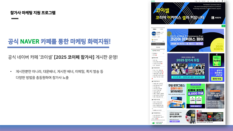 3. 공식 NAVER 카페, [2025 코이페 참가사] 게시판 운영으로 마케팅 지원! 지난 2월 3일, 코리아이커머스페어의 공식 네이버 카페를 오픈하게 되었습니다. 본 카페는 미디어형 커뮤니티로 [이커머스 정보를 제공하는 셀러 전문 미디어]라는 목표를 지향하는데요 오픈 일주일만에 회원이 5천명 넘게 가입되어 많은 관심을 받고 있습니다. 이커머스 사업자가 계속해서 찾을 수 있도록 실용적인 컨텐츠와 분석자료를 제공할 예정이어서 앞으로 더욱 많은 회원가입이 이루어지리라 예상됩니다. 이번회차부터 참가한 기업들은 본 카페의 [2025 코이페 참가사]라는 게시판에서 자사의 상품 또는 서비스를 자연스럽게, 무료로 홍보 할 수 있게 권한을 드릴 예정이고, 카페의 메인 페이지에도 참가한 기업들이 광고가 효과적으로 진행될 수 있도록 현재 기획중이란 점을 알려드립니다.